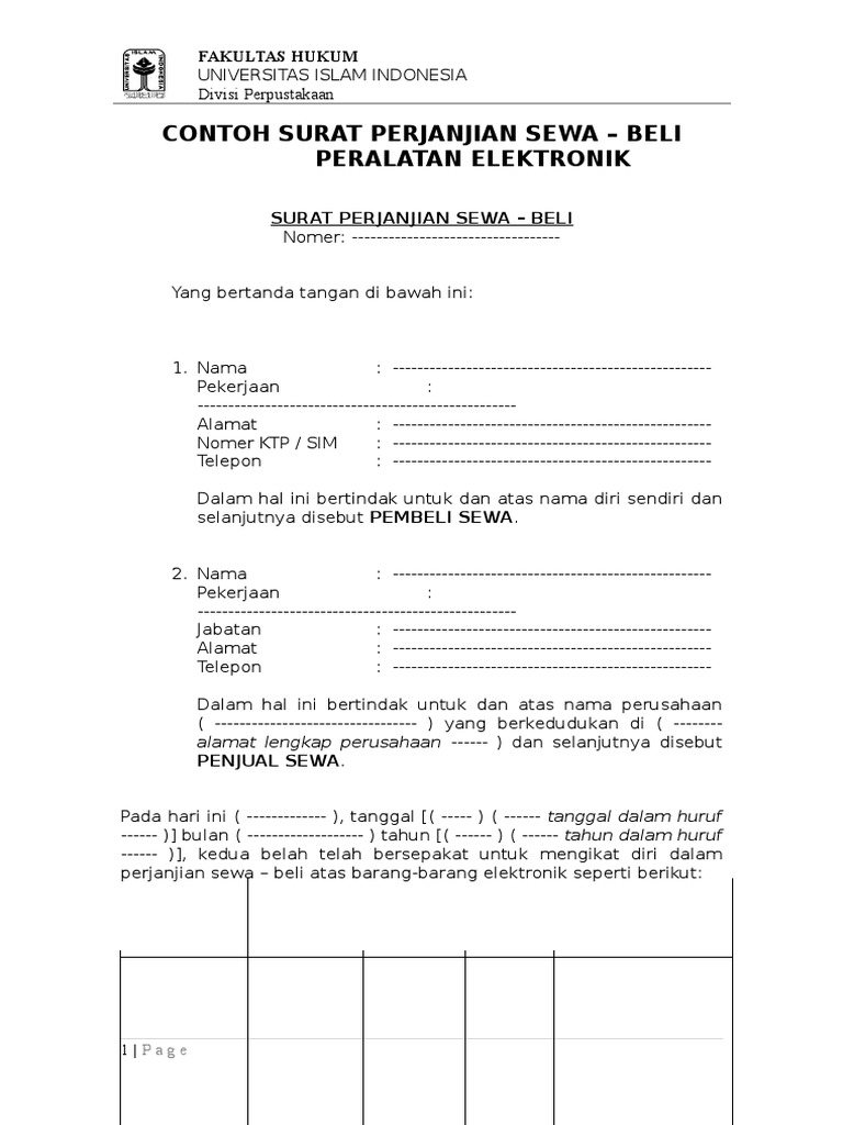 Contoh Surat Perjanjian Sewa Beli Peralatan Elektronik Fh Uii Pdf